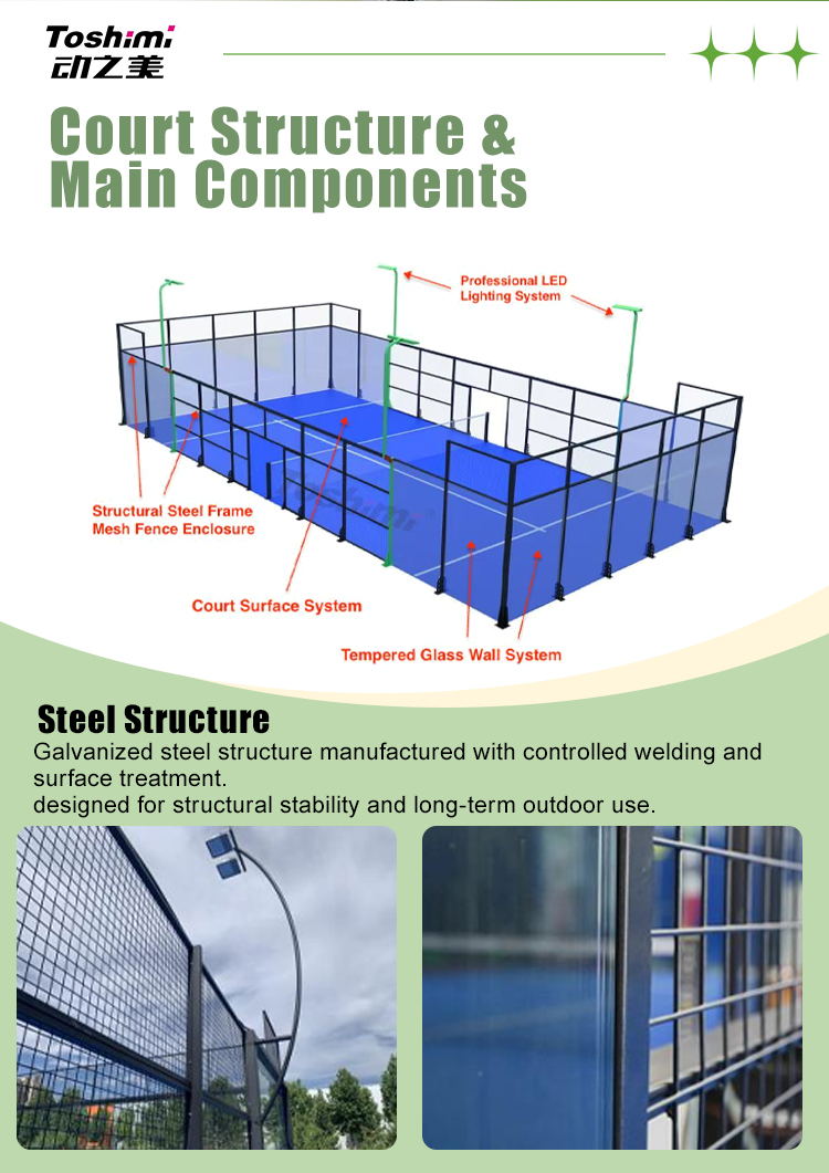 The Classic Padel Court THP04 is engineered for stability in windy conditions. With additional auxiliary support posts on the short sides, it reinforces structural integrity while maintaining the panoramic benefits. Suitable for coastal or open areas, it delivers reliability and performance in diverse environments.