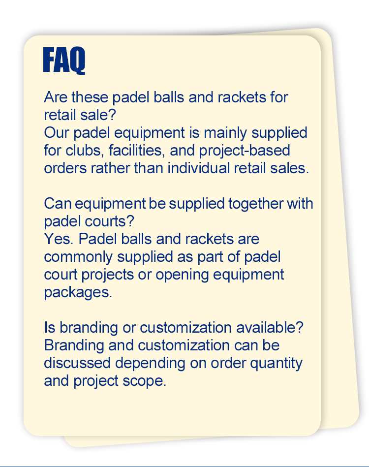 Padel balls and rackets are commonly supplied together with padel court systems to support initial operation and ongoing use.