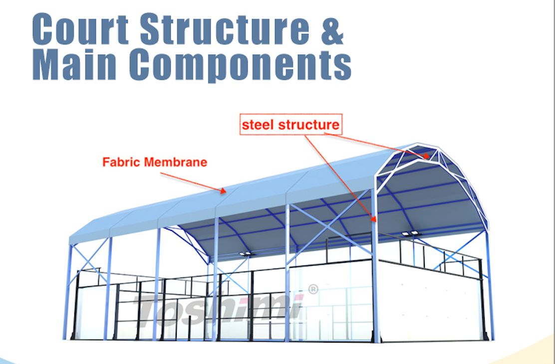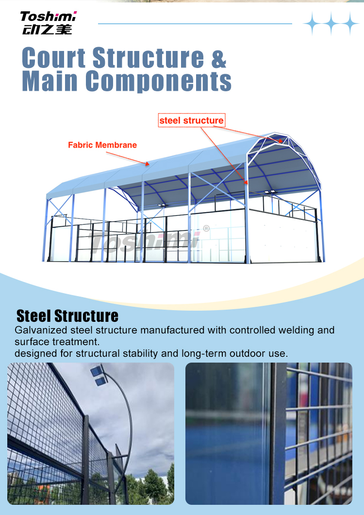 Padel roof structures are designed to protect courts from weather conditions while maintaining proper playing performance and visibility.