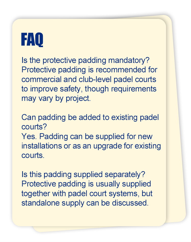 This protective padding is used to improve player safety and reduce impact risk around gates, posts, and net areas, and is typically installed as part of complete padel court projects.