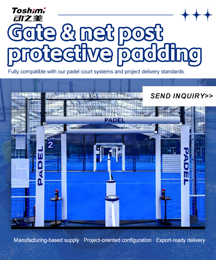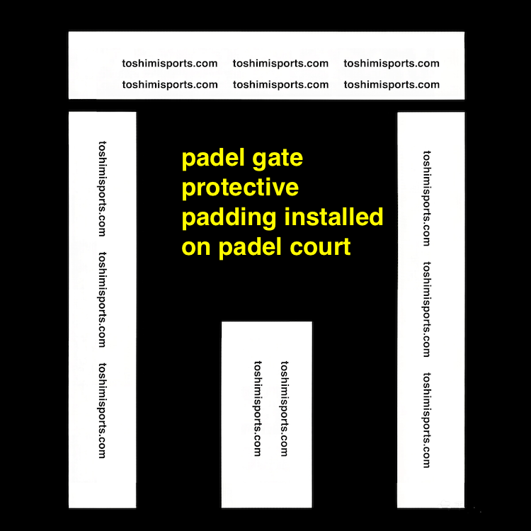 Toshimi Sports supplies gate and net protective padding designed for padel court systems.